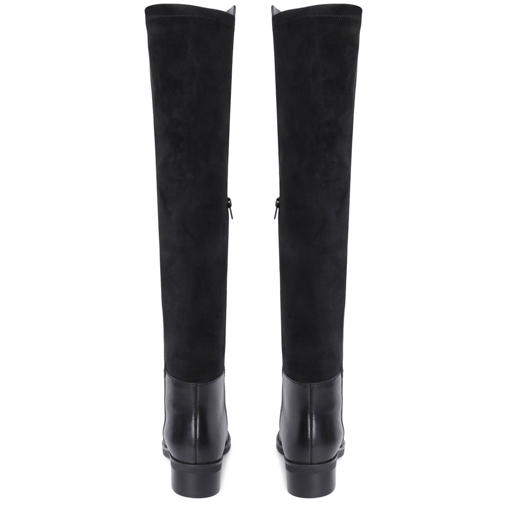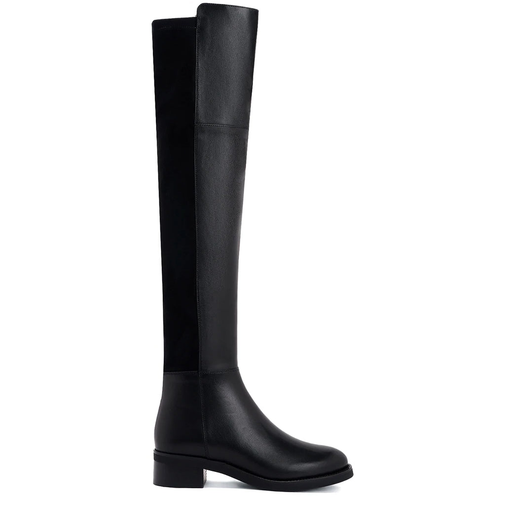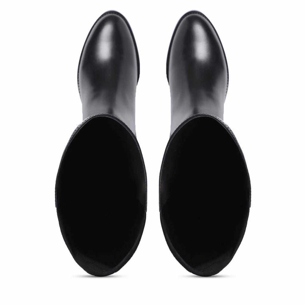 These black boots are crafted from 100% genuine leather with back stretch suede, raised front, fleece and leather lining for a luxurious feel, padded leather footbed provides lasting comfort. Featuring back stretch suede for the perfect fit around the calf, an inside zip closure to ensure comfortably slip them on and off.