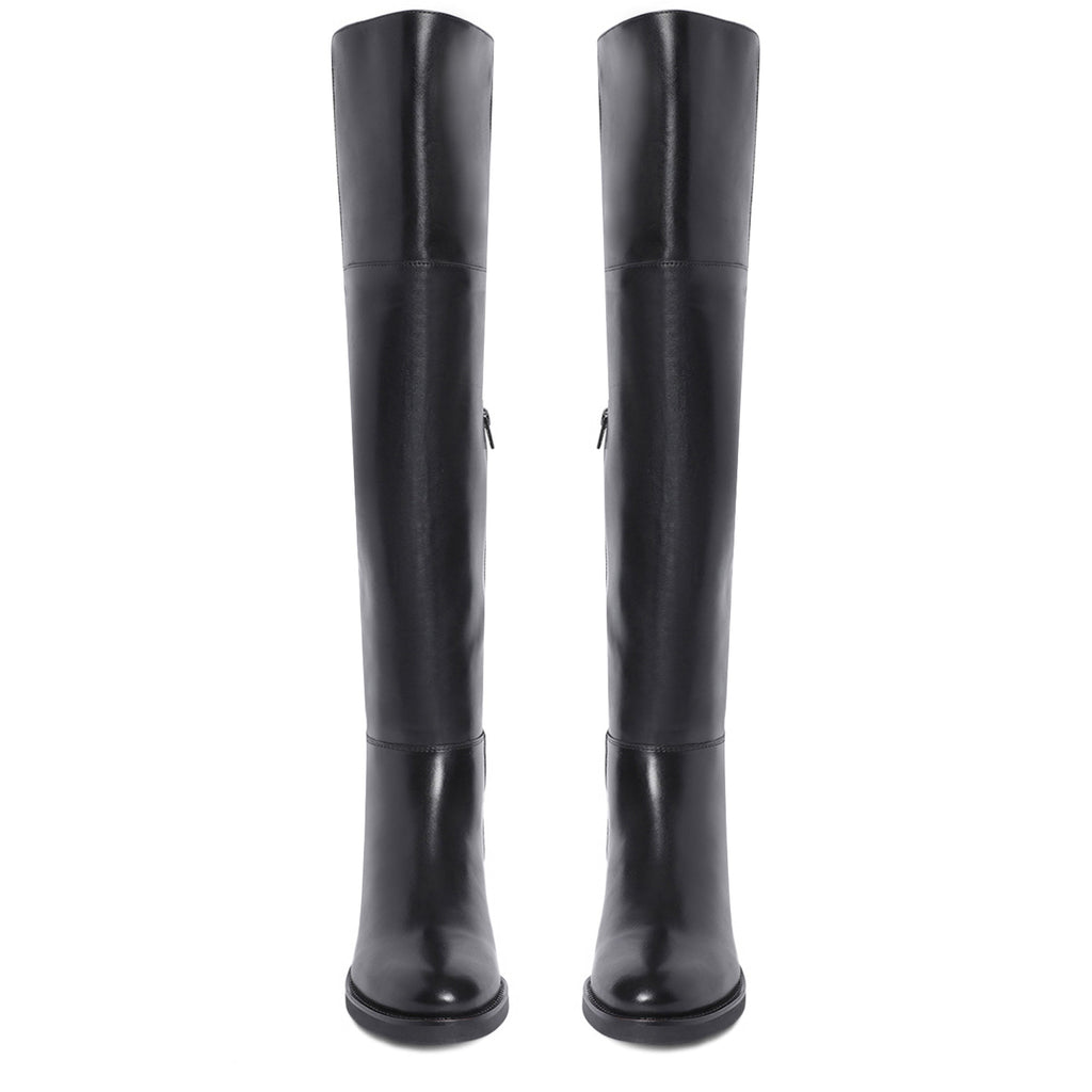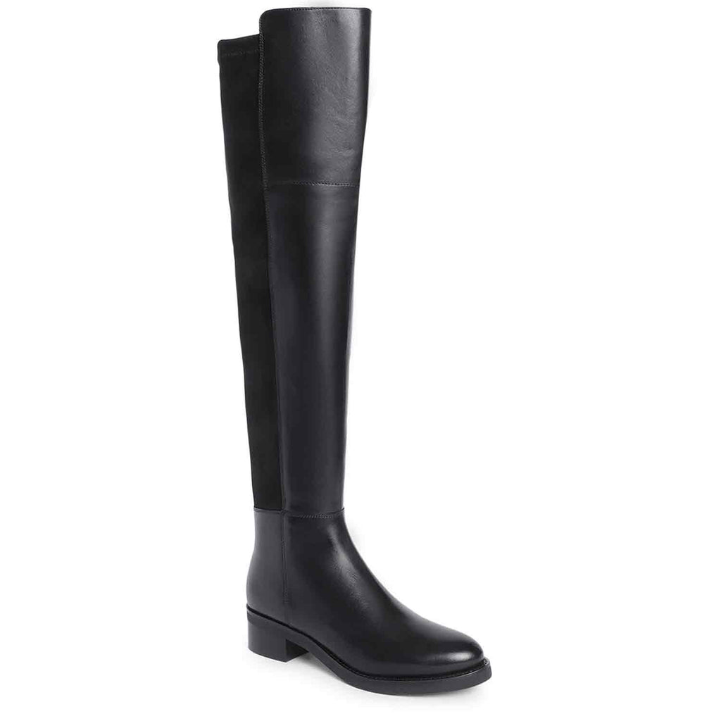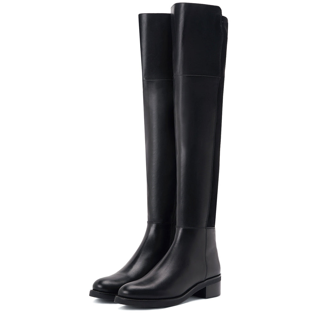 These black boots are crafted from 100% genuine leather with back stretch suede, raised front, fleece and leather lining for a luxurious feel, padded leather footbed provides lasting comfort. Featuring back stretch suede for the perfect fit around the calf, an inside zip closure to ensure comfortably slip them on and off.