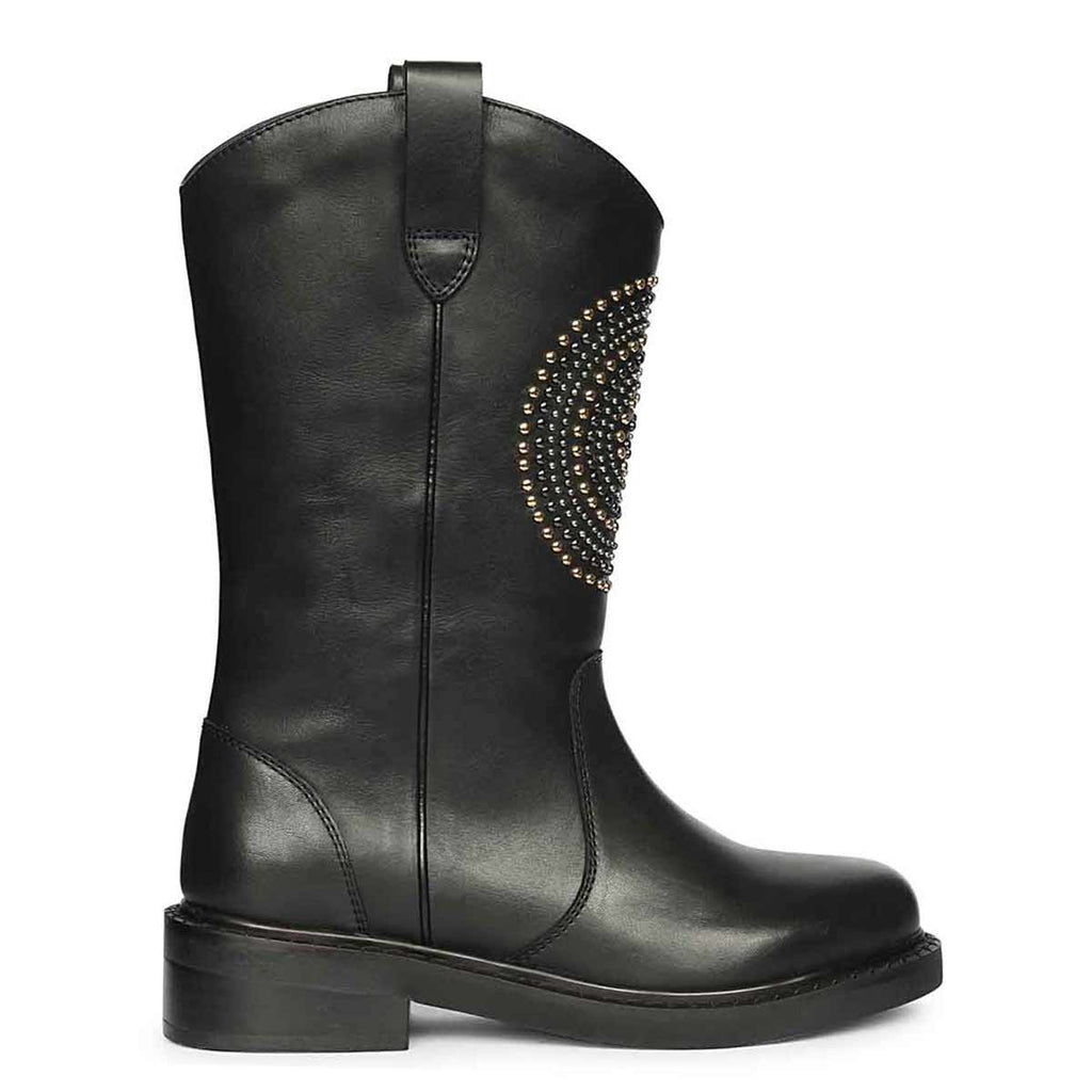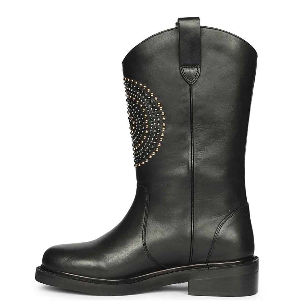 Saint Lilah calf boots featuring pull-on tabs and stud embellishments that catch the light.  A rounded toe and stacked block heel rest on a stitched welt sole, combining durability with modern attitude. Designed for statement dressing, these boots pair seamlessly with denim, skirts, or layered outerwear.