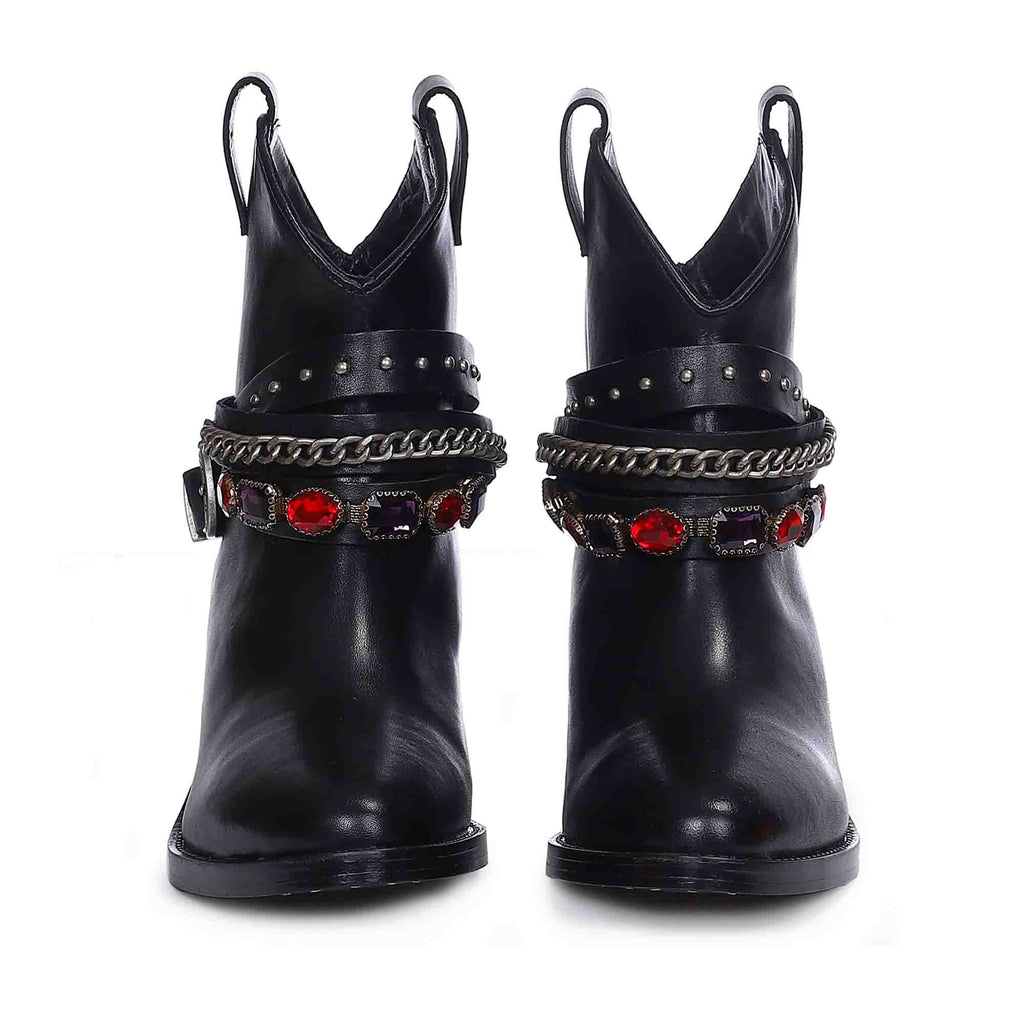 A pair of Saint Louanne black leather cow boy luxury boot from SAINT G, with detachable rhinestone embellished, roman handcrafted metal buckled leather strap covered with metal studs, chain and multi stones. feature nailing and stitching on handcrafted tunit sole. The accented wrap straps buckles give these boots a fashion forward look. Perfect for any time of the year,