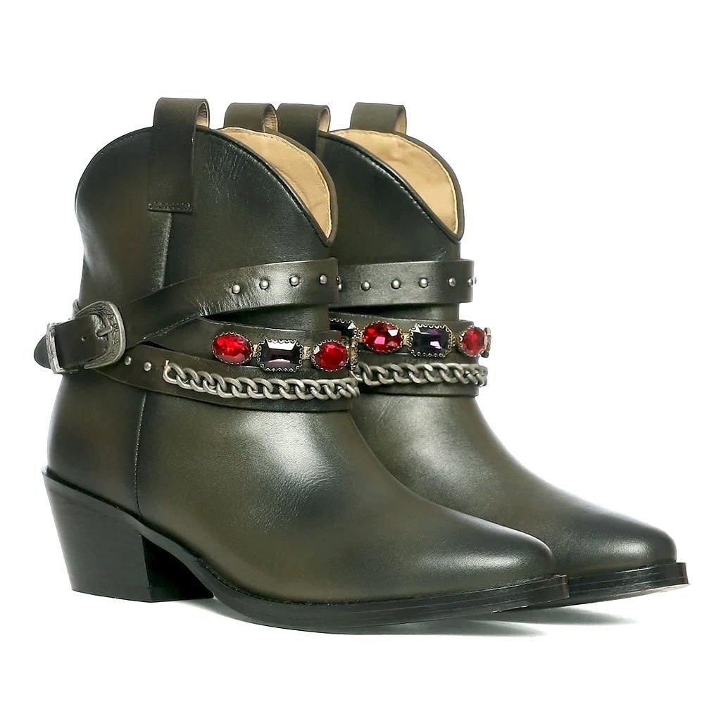A pair of Saint Louanne olive leather cow boy luxury boot from SAINT G, with detachable rhinestone embellished, roman handcrafted metal buckled leather strap covered with metal studs, chain and multi stones. It feature nailing and stitching on handcrafted tunit sole. The accented wrap straps buckles give these boots a fashion forward look. Perfect for any time of the year,