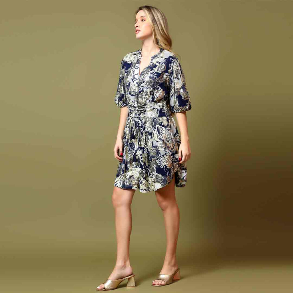 Saint Womens Blue Metallic Printed Viscose Lurex Short Dress