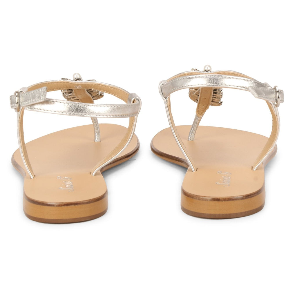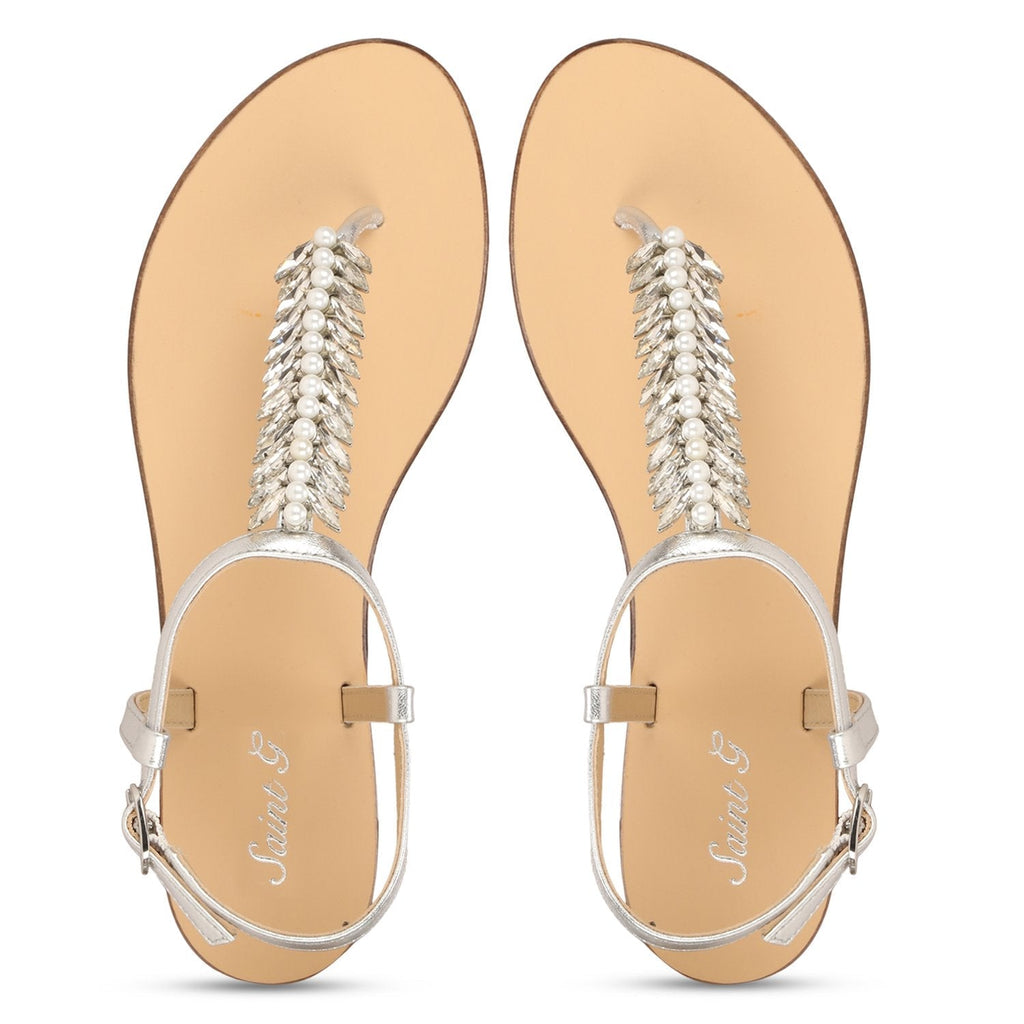 Elevate your everyday style with the hand crafted Silver metallic leather flat sandals from Saint G. Complete with pearl and stone embellishment, Its secured with buckle fastening strap. Made using quality materials and finished with trending details.