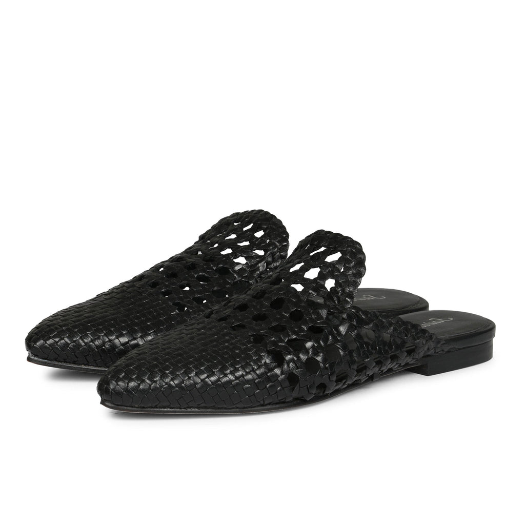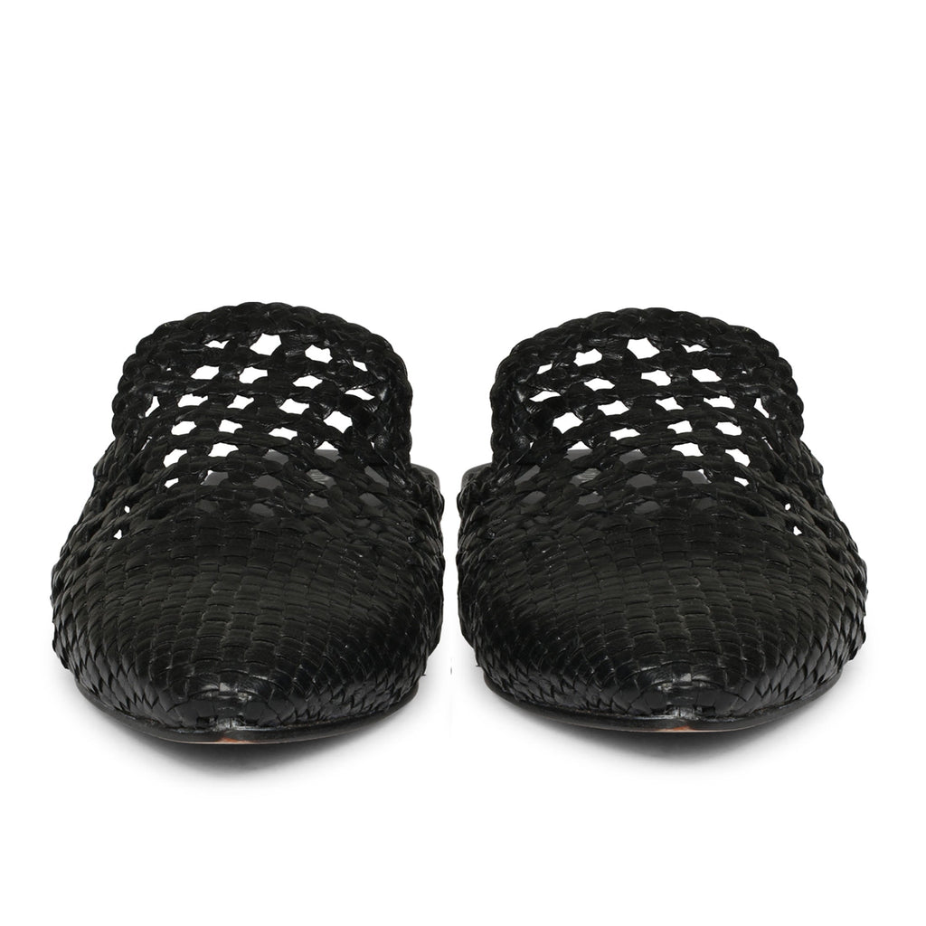 A pair of black woven leather pointed toe flats muels , has regular styling.