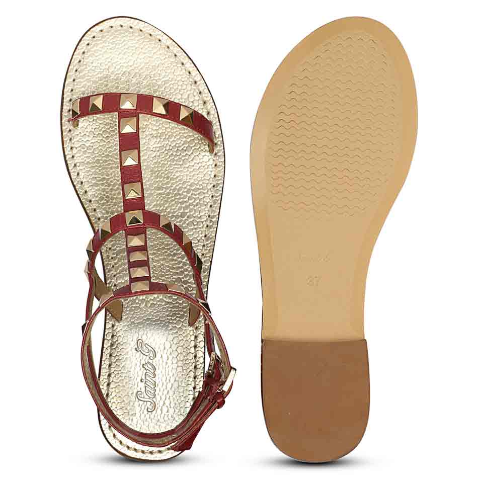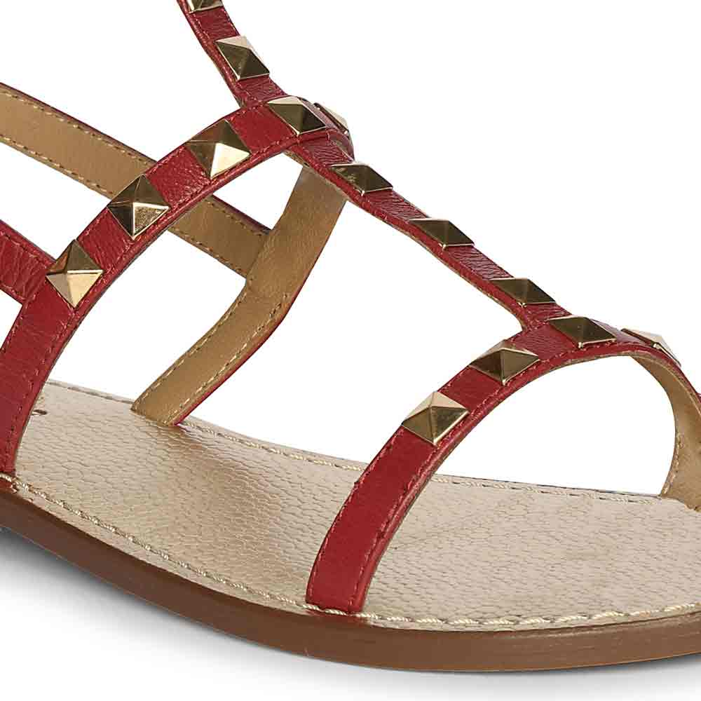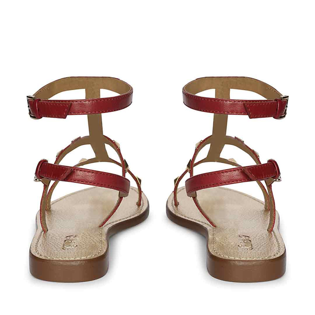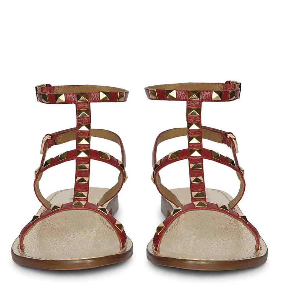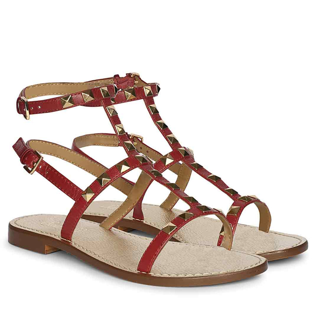 Step into luxury with these metal-studded red leather sandals from SaintG. They're crafted from premium leather with a smooth leather lining and sole. The easy slip-on design features double buckle ankle fastening, while gold metal studs add a bold touch. Finished with the signature SaintG branding on the sole and insole.