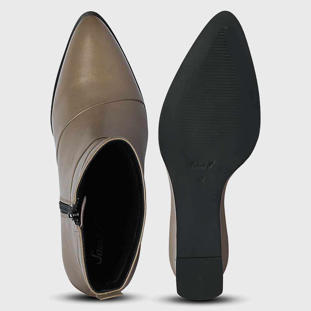 Artfully constructed in buttery stone color leather, this wedge boot features a folded upper and a pointed toe. Clean, tonal, and quietly commanding- the perfect blend of ease and elegance.