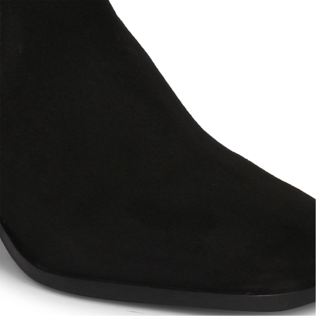 Meet Saint Rachel black suede leather high ankle boots, the new classic. Set the trend this season in these Genuine leather suede boots from SaintG, these boots are sure to turn heads. Fitted with elasticated side gores to easily slip on and off. The premium leather upper assures comfort, while the handmade tuit sole guarantees traction irrespective of the surface. The leather covered mid block heel and rounded toe completes the design. Featuring orange Genuine leather lining for a luxurious feel, padded leather footbed provides lasting comfort. The slip on closure boot sit on a tunit sole. Designed in Milan.