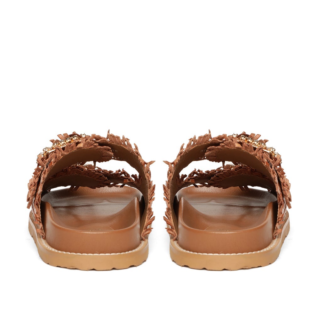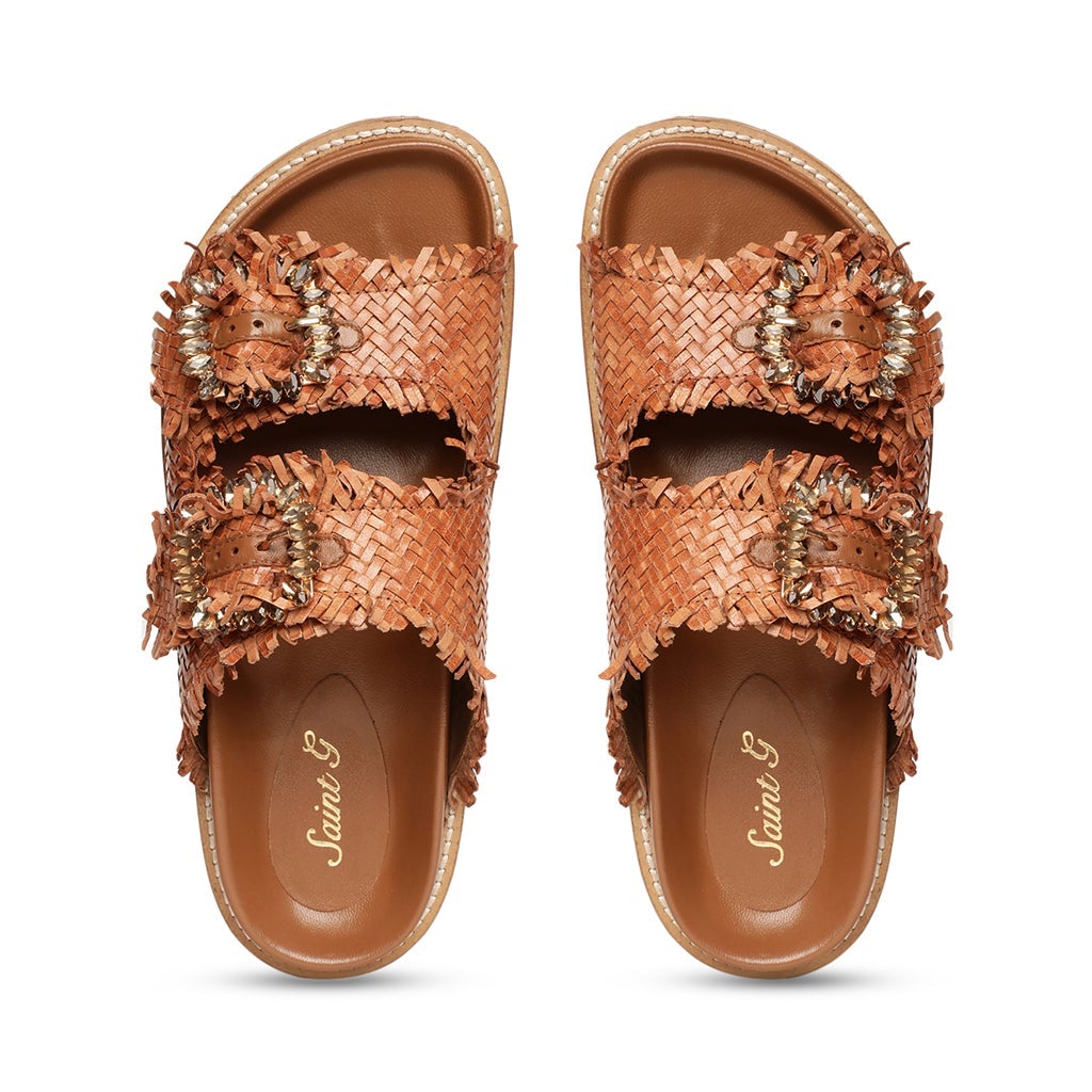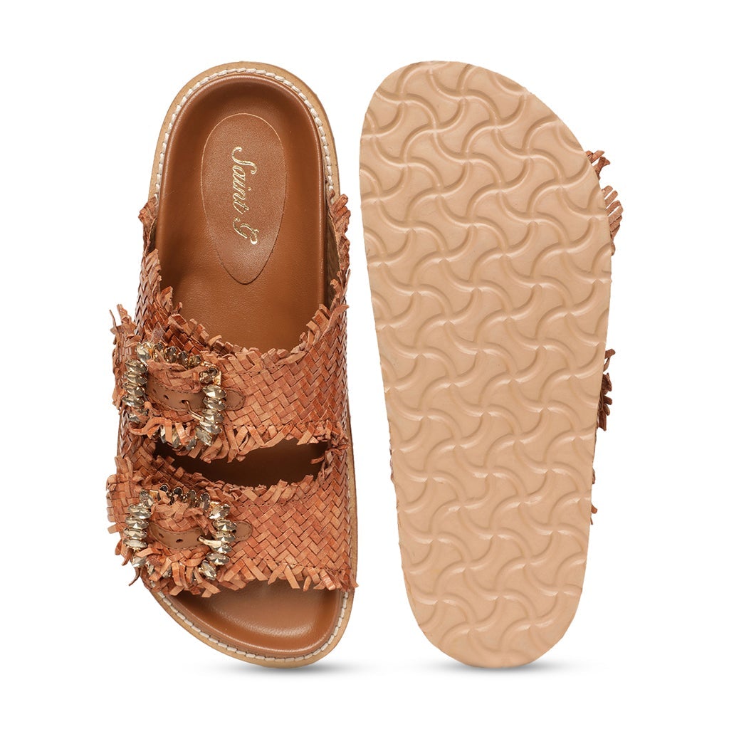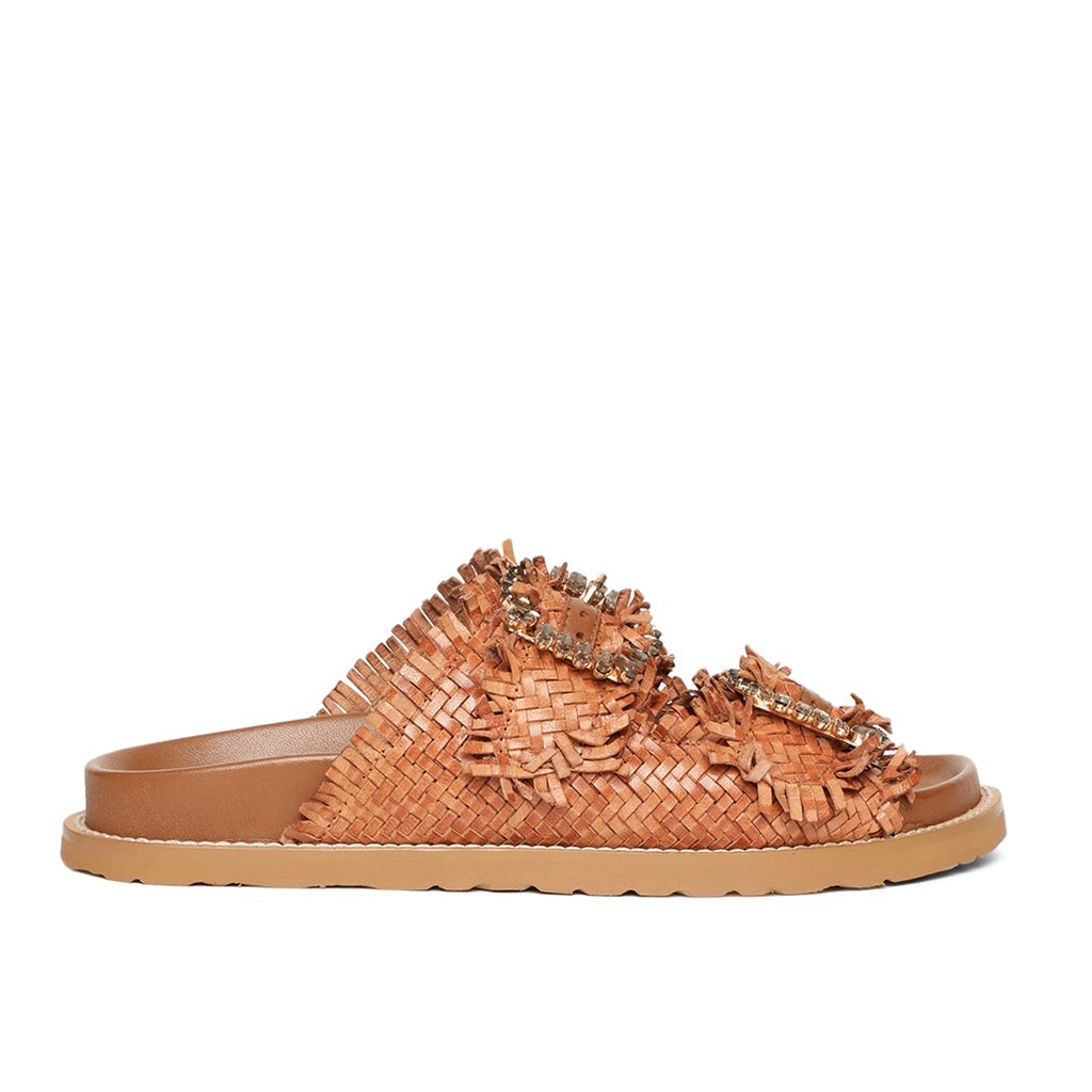 Ultra stylish and ultra chic, this fringed woven leather sliders is an absolute must-have for your summer. These cannot be missed when you pack your suitcase for your next wonderful holiday. Shaped leather insole and ultralight outsole will make you feel totally at your ease. These stylish sliders have a jeweled double buckle making them a little more stylish. They will look perfect with all dresses  the combinations are endless. You won't take them off anymore!