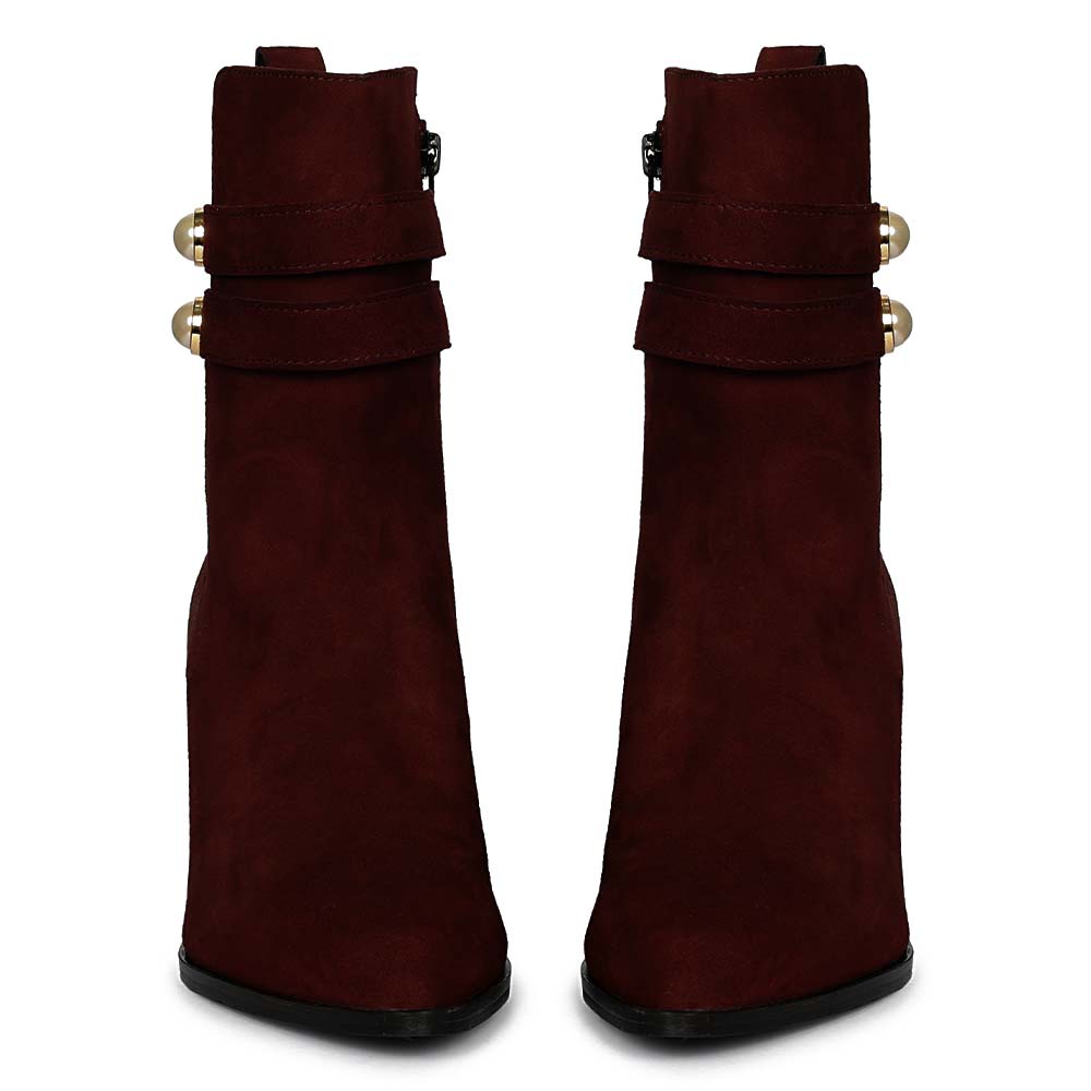 Sculpted in rich bordo suede, these wedge boots balance elegance and edge. The pointed toe and wedge heel elongate the silhouette, while twin pearl-accented straps add a polished, feminine twist. An effortless upgrade to tailored looks and statement layers.