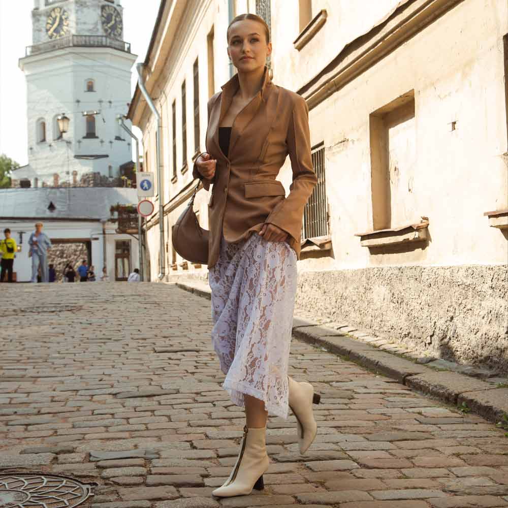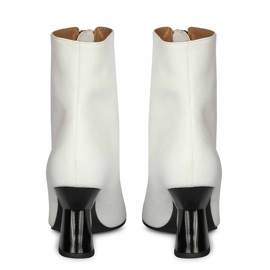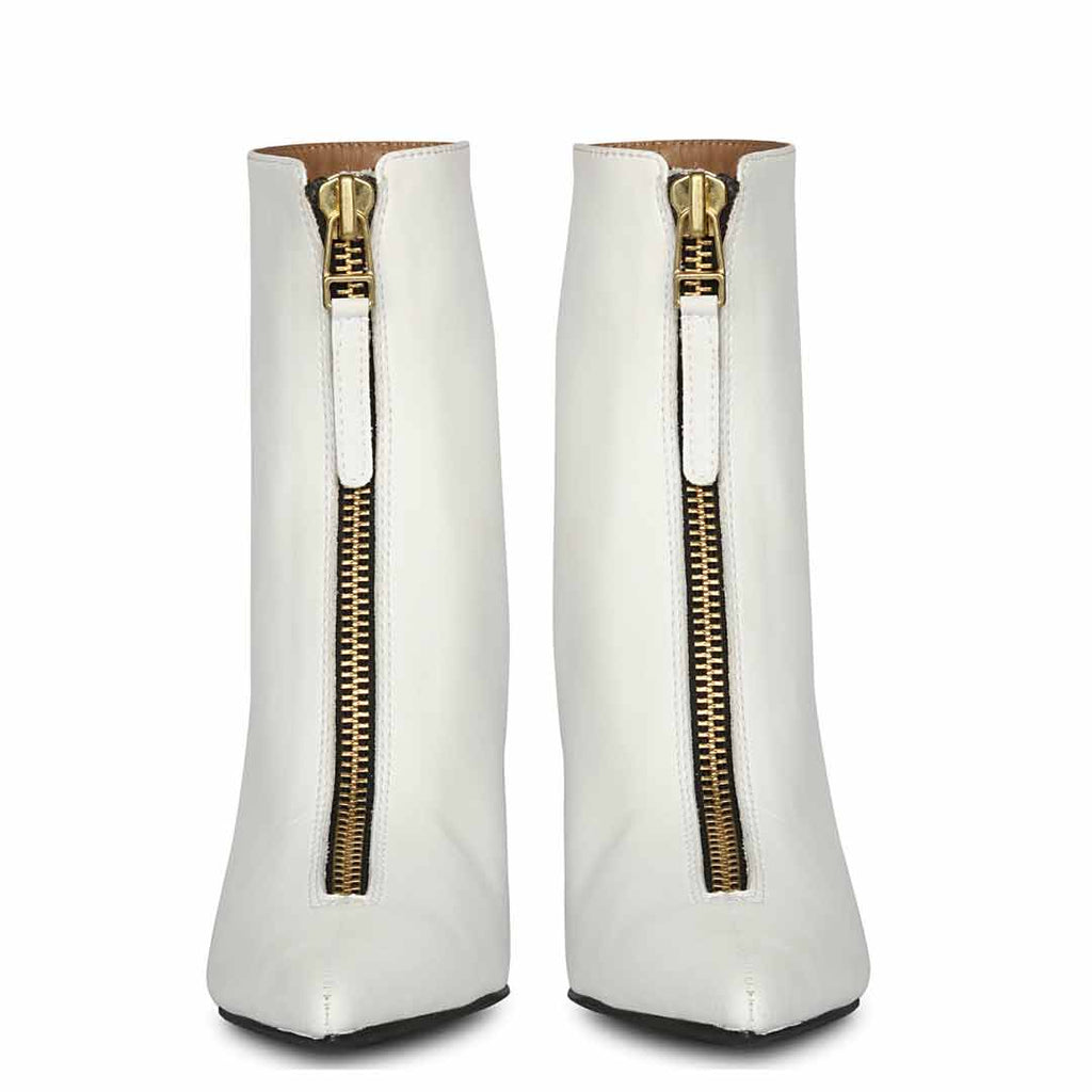 Featuring front zip closure, a pointed toe, white leather upper, leather lining and branded leather insole. The slip on boot sit on a sculptural heel. Pair with a cute day dress and kill it babe.