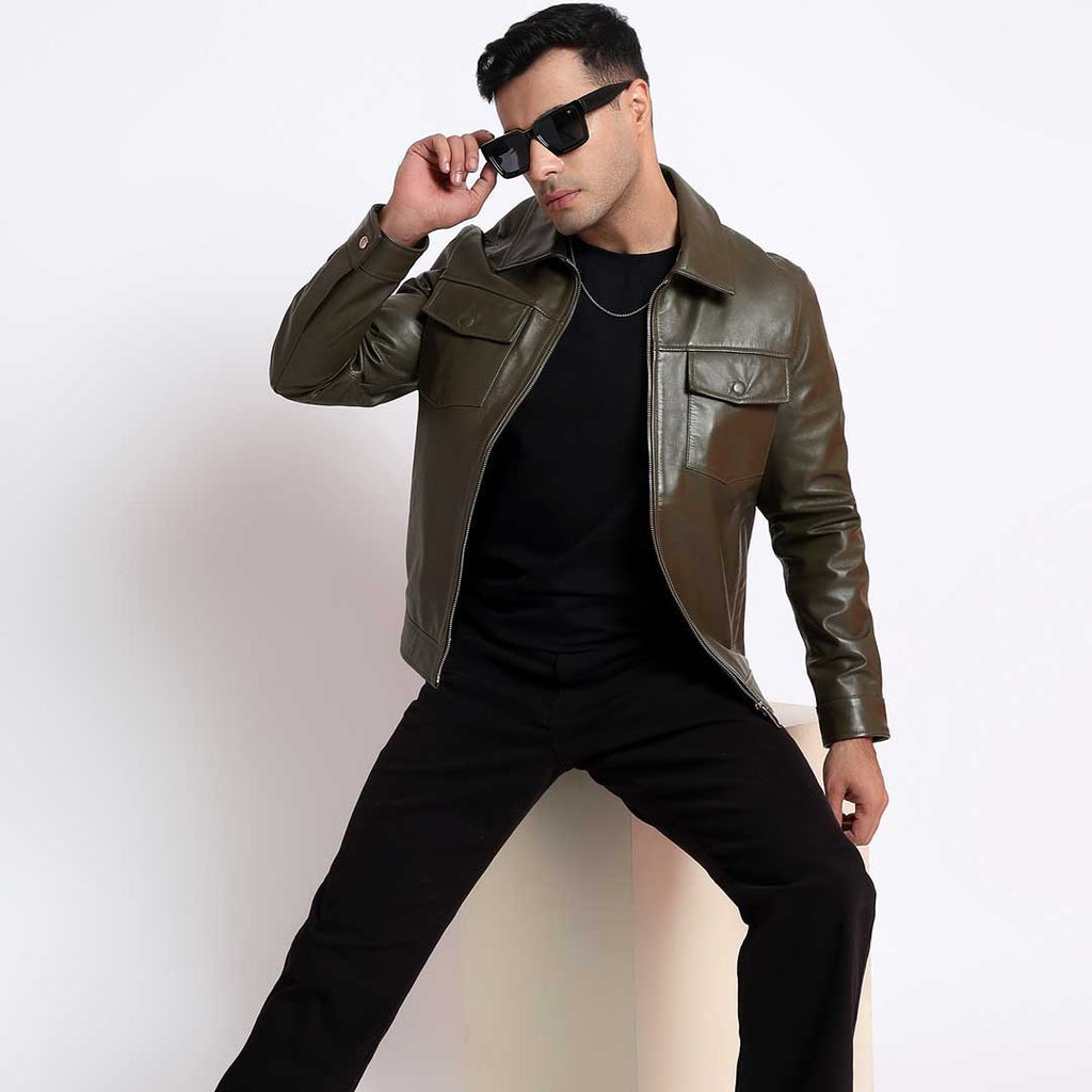 Saint Ruben Olive Leather Men's Jacket With Collars