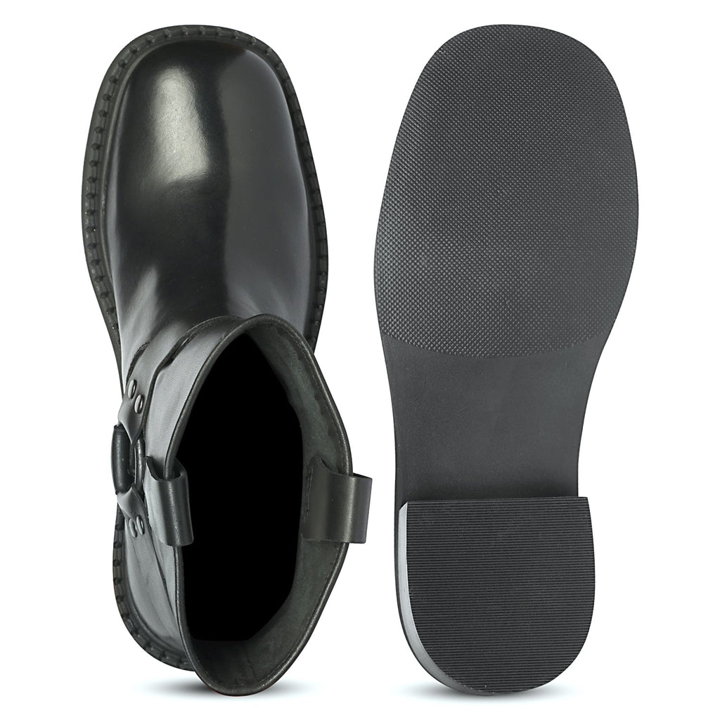 Command the street in these Sally black leather high ankle boots, elevated with a bold O-ring harness and rivet detailing. Set on a premium eva sole for effortless stride and attitude
