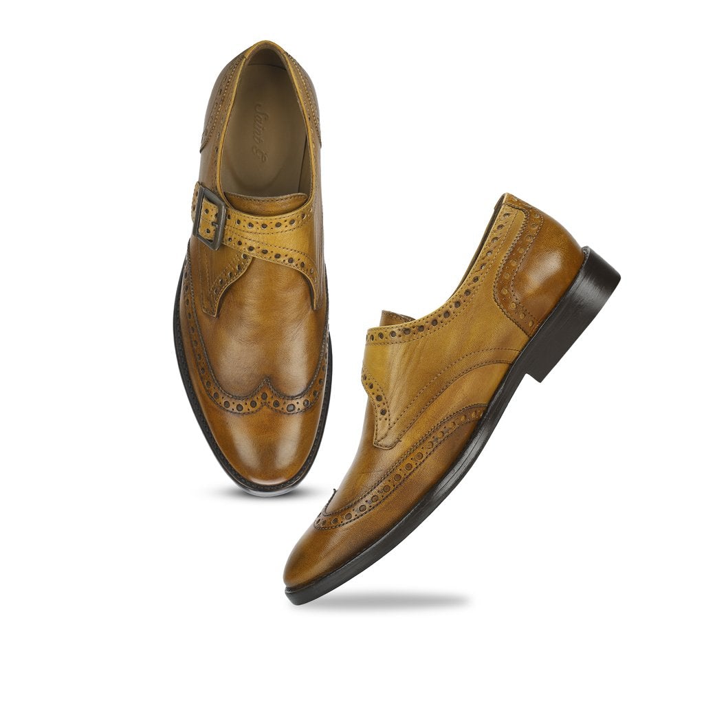 Handcrafted Leather Shoes:- A pair of handcrafted two color toned tan leather buckled monk strap shoes from SaintG. Featuring a side buckle fastening and decorative perforations. Its complete with leather lining, padded leather insole, stitched panels and a leather sole, nailing on heel and welt 6mm with stitch.