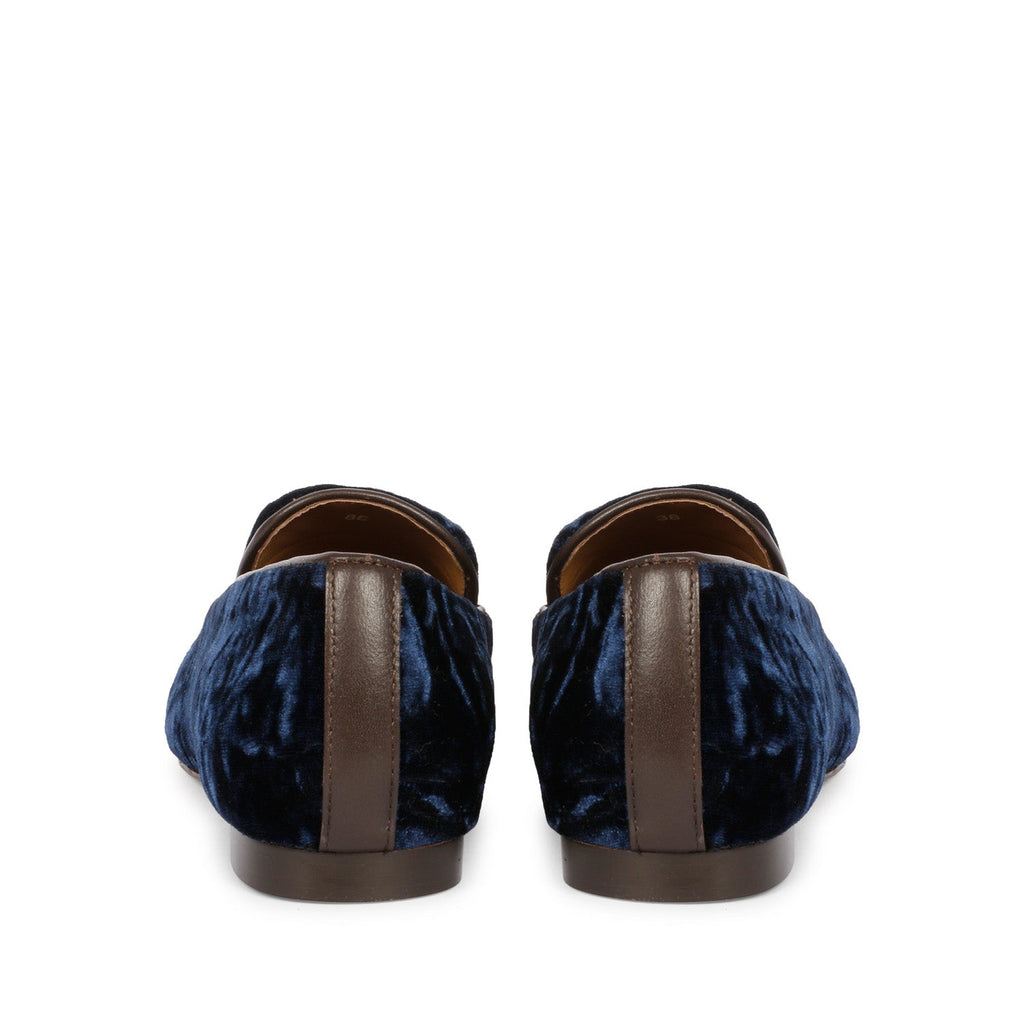 Simona moccasins feature blue velvet/brown leather upper, natural leather lining, padded leather sock & tunit sole.