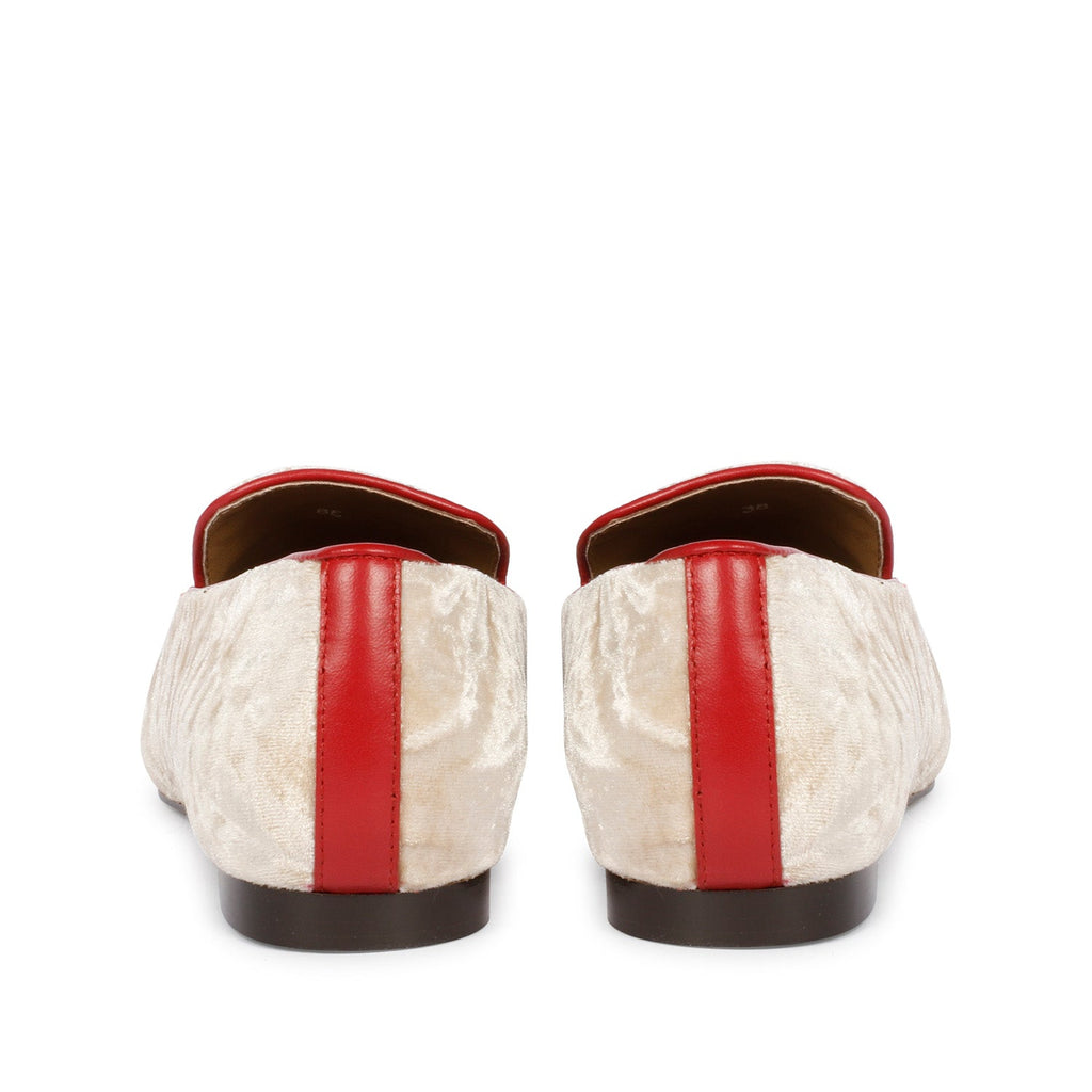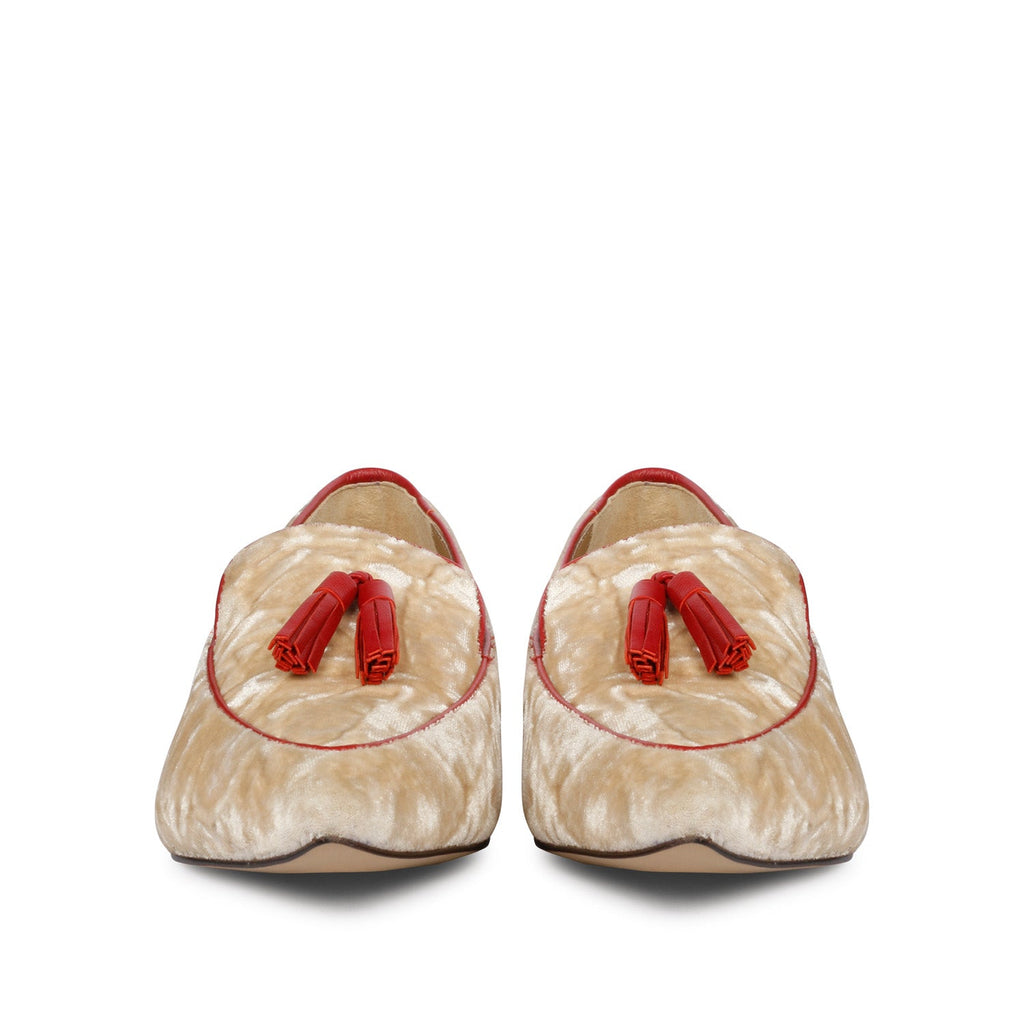 Simona moccasins feature cipra velvet/red leather upper, natural leather lining, padded leather sock & tunit sole.
