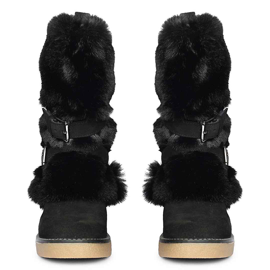 Wrap your feet in luxury with the Snövella Snug Fur Boots, crafted in rich black suede leather and topped with cloud-soft faux fur. Featuring stylish buckle straps and a sturdy block heel, these boots are made to turn heads while keeping you cozy through the coldest days.