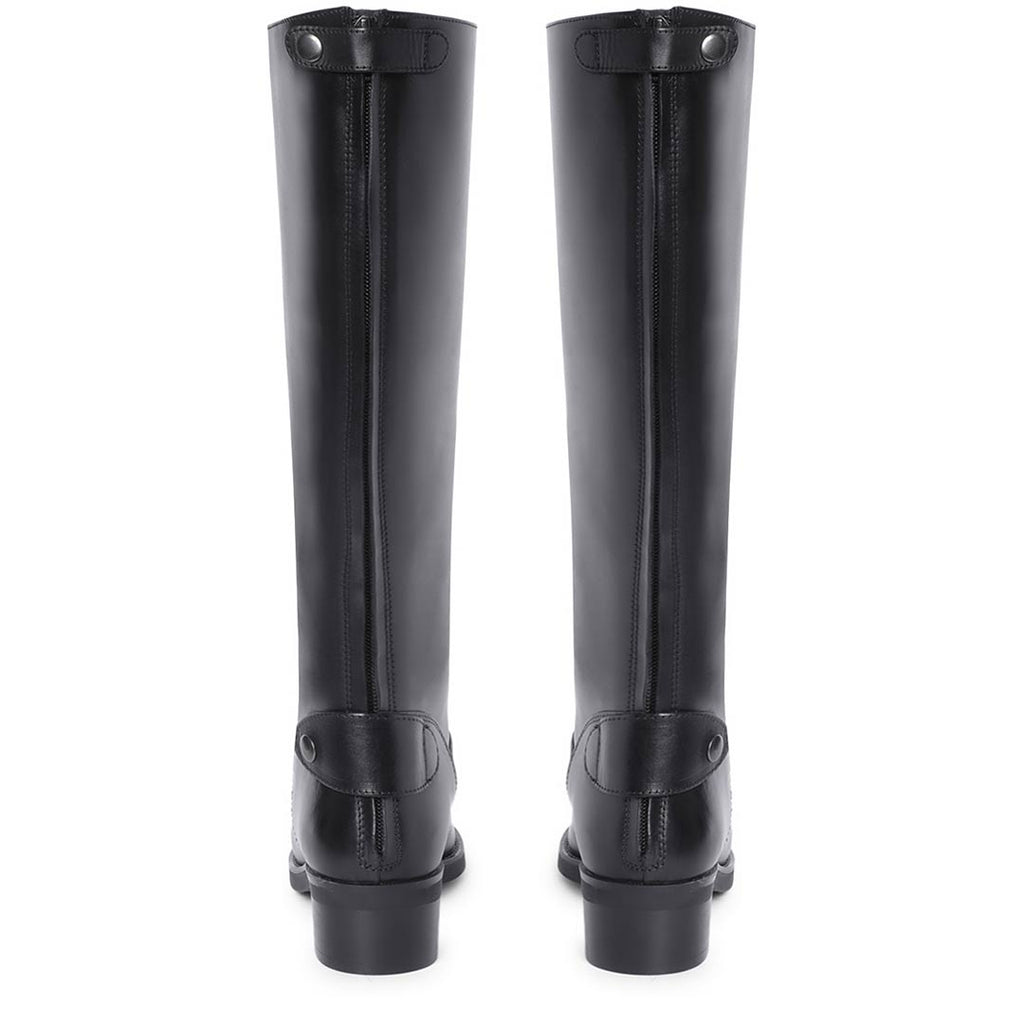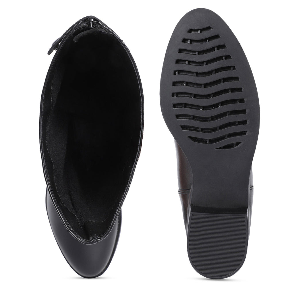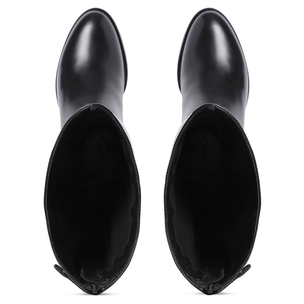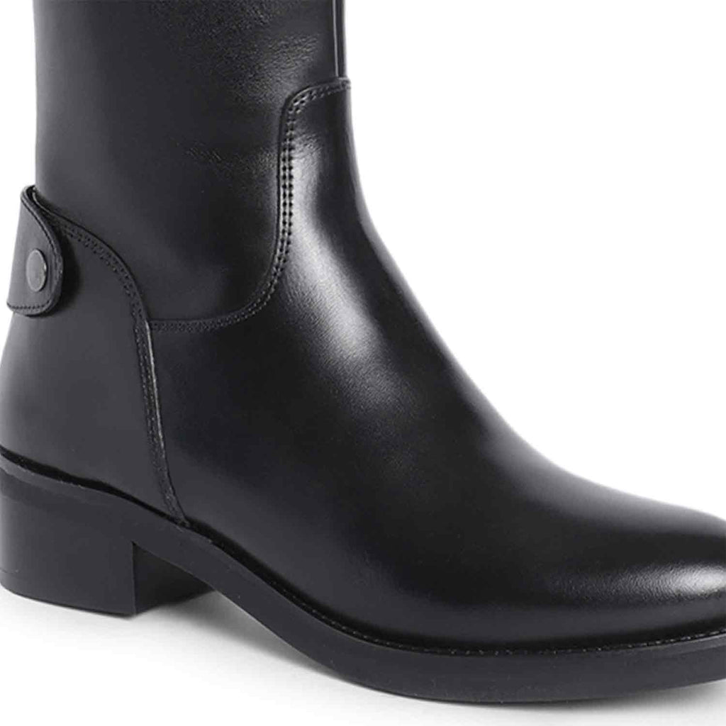 Crafted from luxurious, rich leather, the Saint Stella Black leather boot features a round toe, a back zip fastening. Metal button-embellished straps for easy dressing. complete with a soft fleece and leather lining, padded leather footbed and tunit sole. Made from the finest materials and finished with trending design details. these premium quality leather boots are constructed using an anti skid handmade tunit sole which ensures that you do not accidentally fall on any surface. Fitted on a low heel, this boot feels as good as it looks.