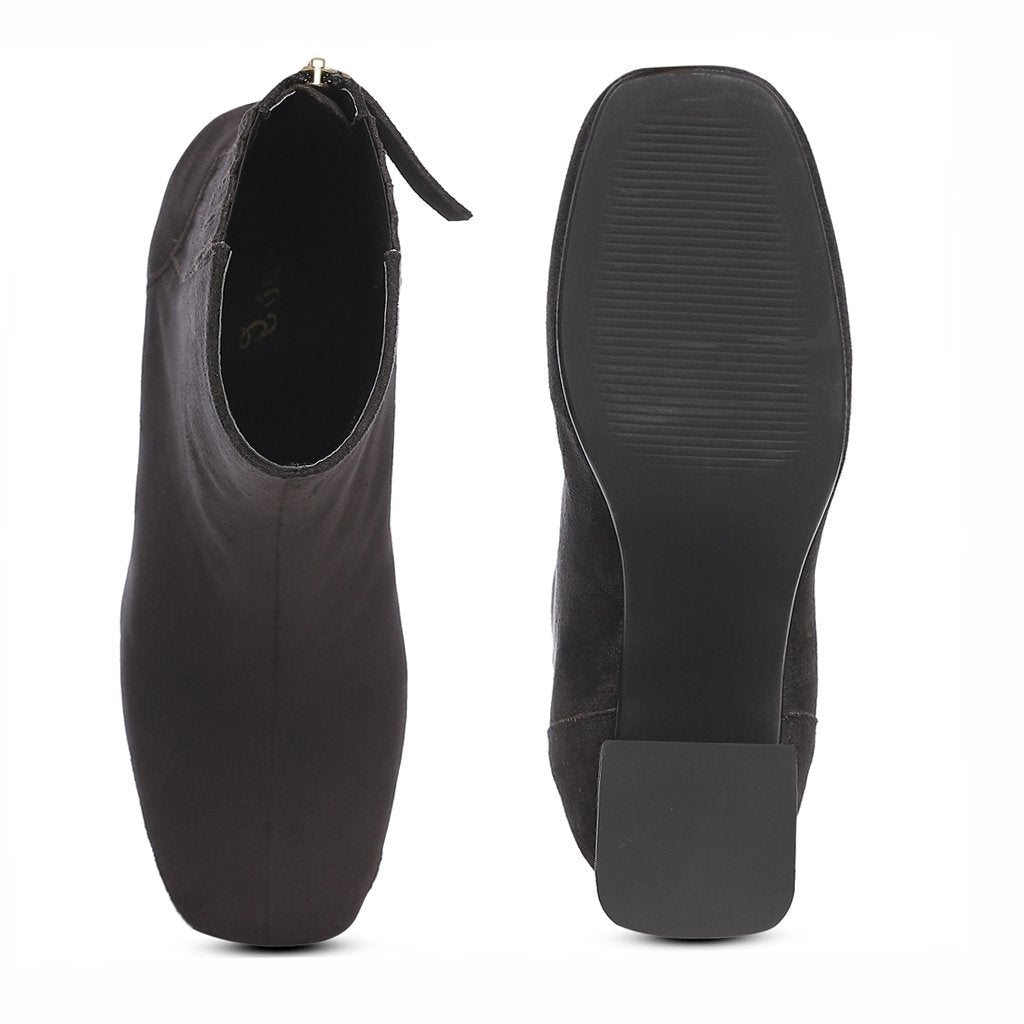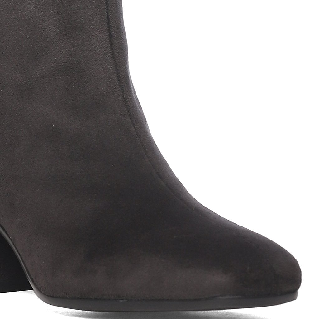 Reach new heights in the Stylish Stellina block heel Boot. A pair of handcrafted grey suede pointed toe leather boot, has a slip on closure. Featuring covered elasticated side panels and back zipper to ensure comfortably slip them on and off. Its complete with leather lining and padded leather footbed. The slip on boot sit on a covered block heel.