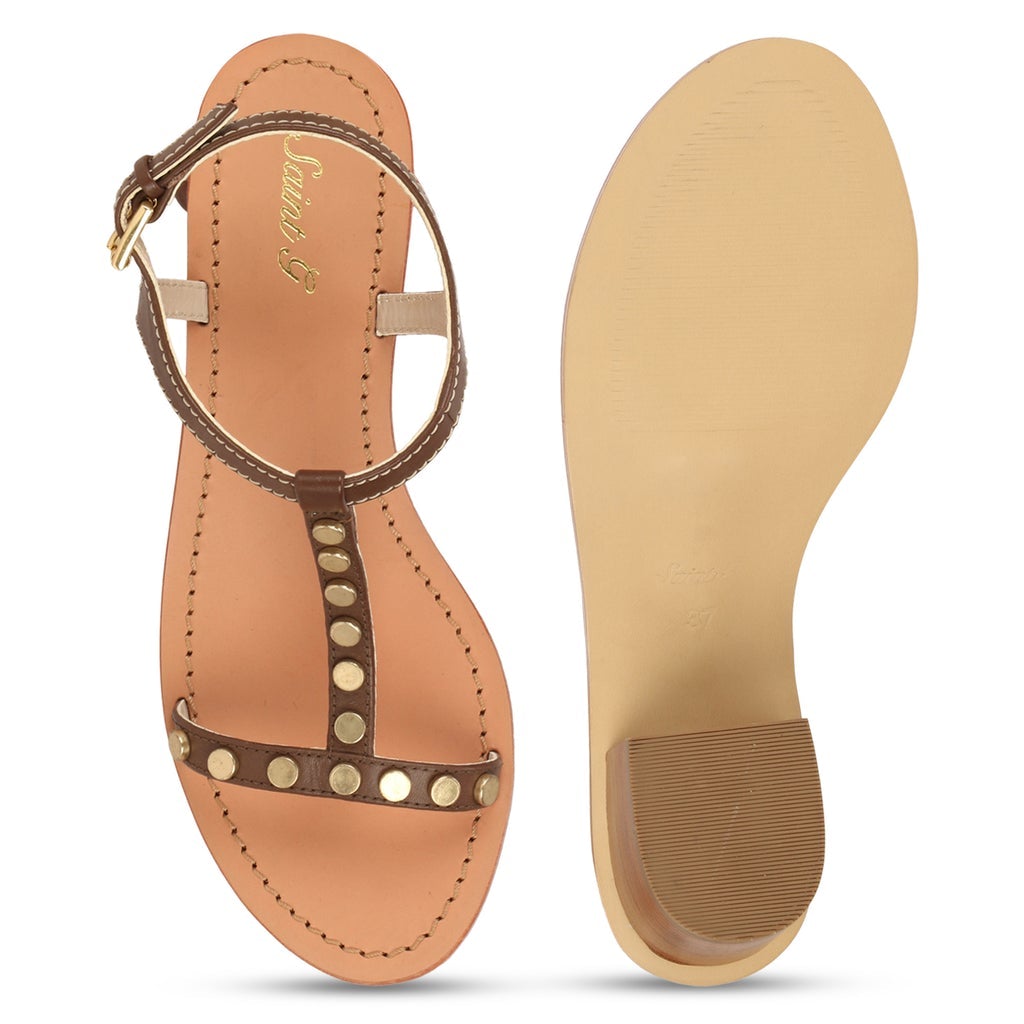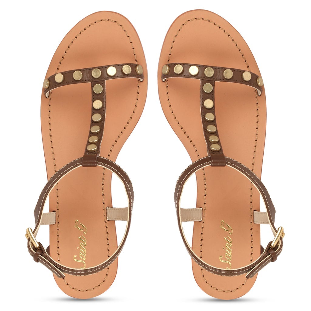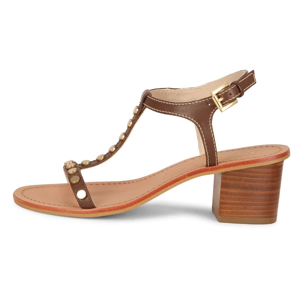 Saint Irmina Tan Leather Gold Metal Studded Block Heel