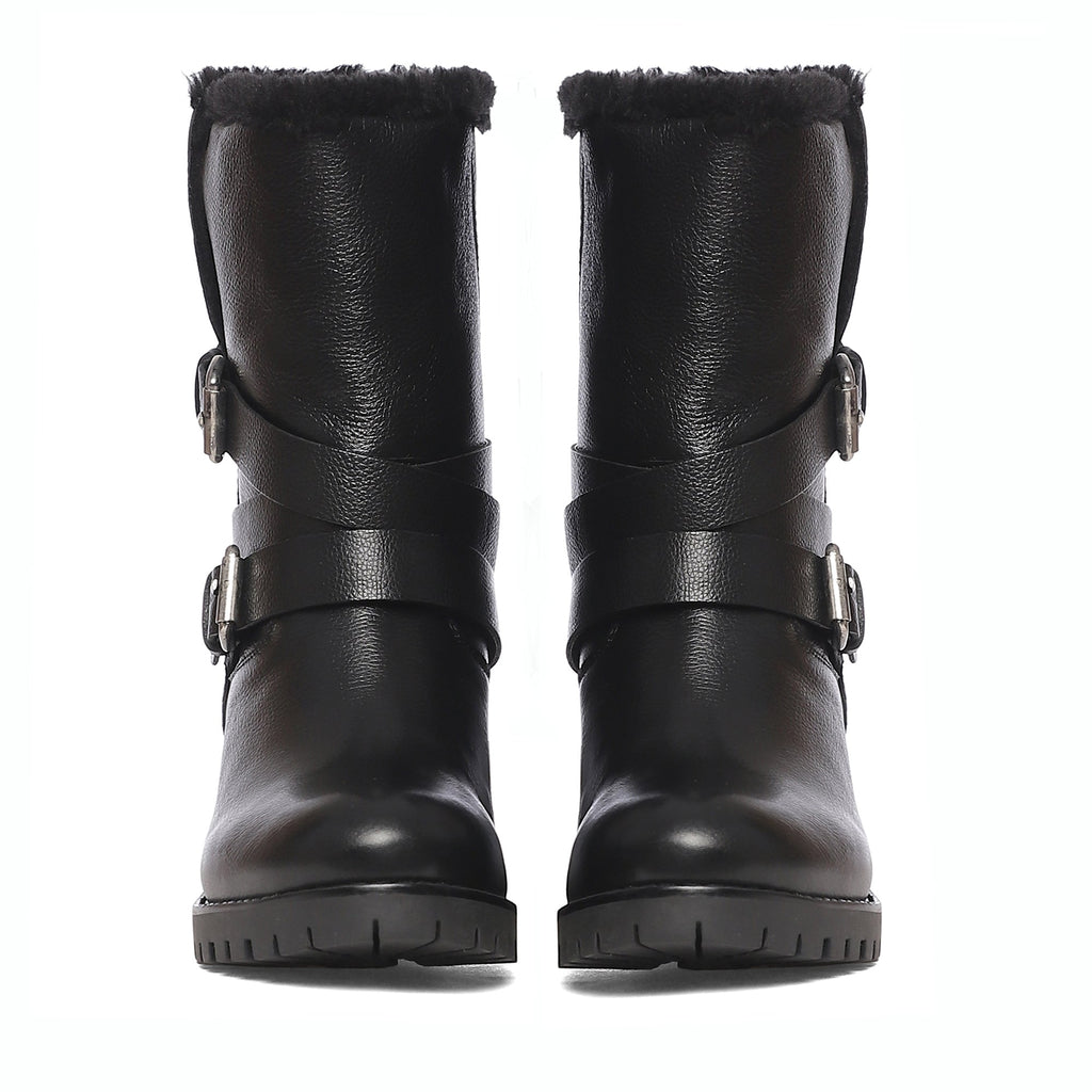 Make a dazzling fashion statement with these leather handcrafted Buckle decorative high ankle boots from SaintG. Features a leather upper that provides comfort and enhances the overall look, a round toe, biker sole, slip on closure, fur lining and padded leather insole for comfort.