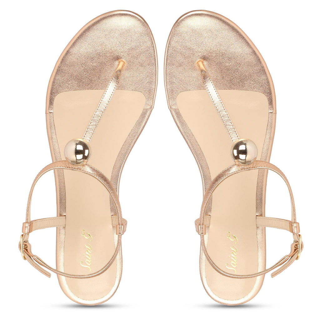Elevate your everyday style with the handcrafted gold leather flat sandals from SaintG. Complete with metal ball embellishment, Its secured with buckle fastening strap. Soft leather lining, leather insole and tunit sole complete this stunning pair.