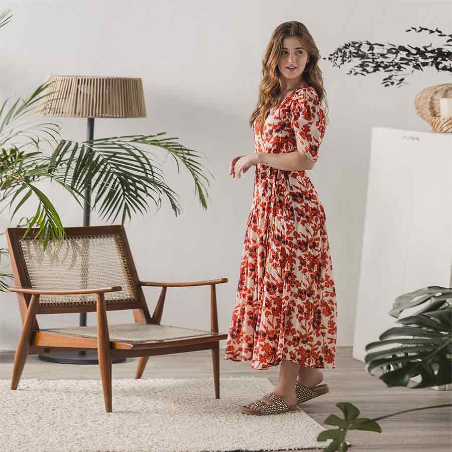 Saint Womens Ivory Red Deep V-Neck Viscose Dress
