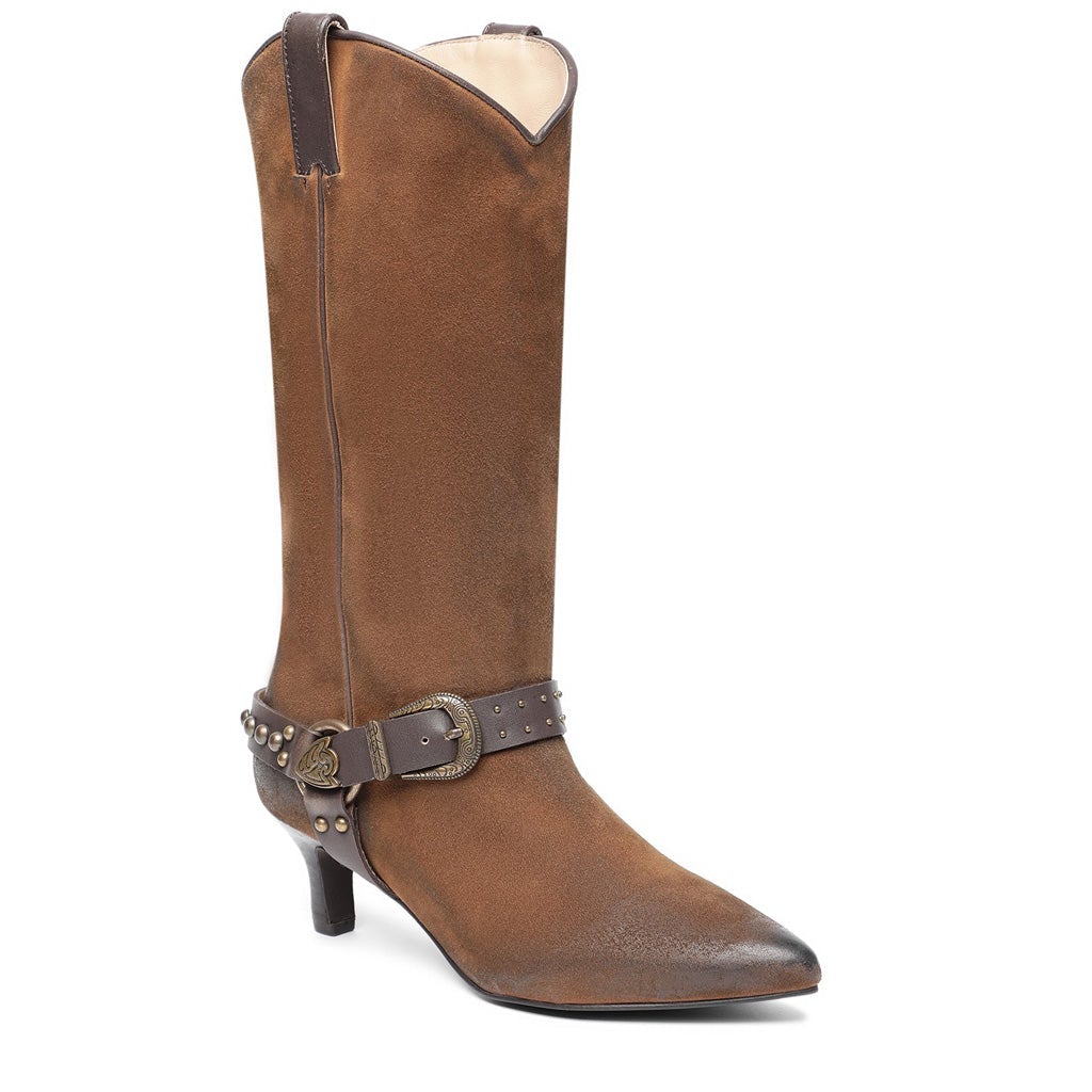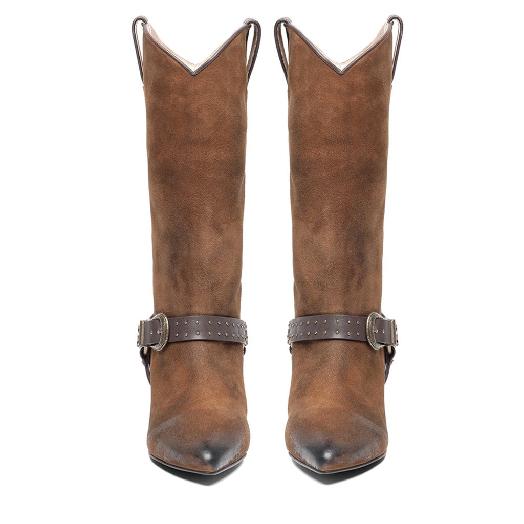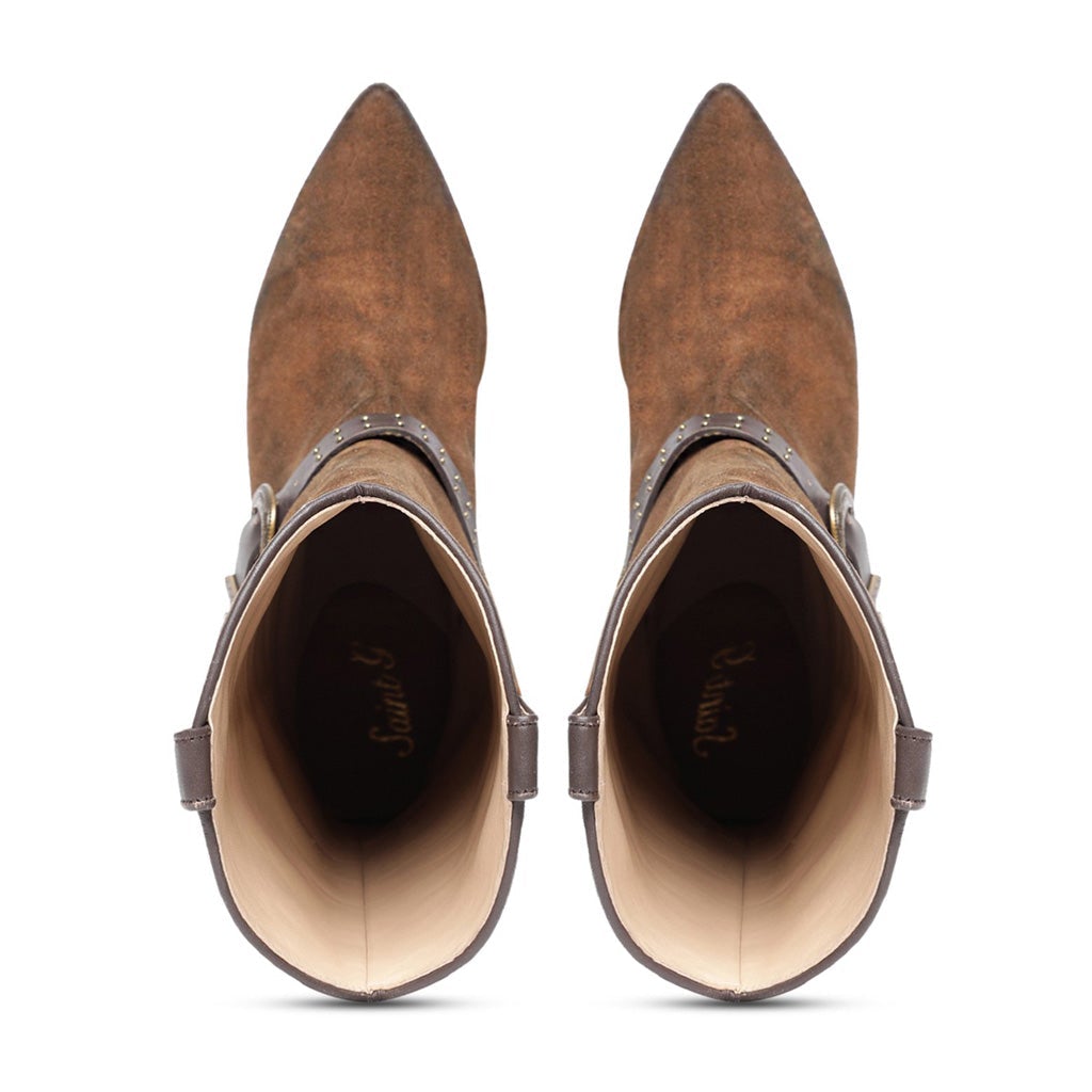 A pair of Saint Zoi Ten patent leather cowboy boot with stitched suede leather upper and leather loop both side on top and leather sole. One of the most prominent patterns on this season , designers from Saint G showed head-to-toe, color-blocked looks for their spring 2021 collections.