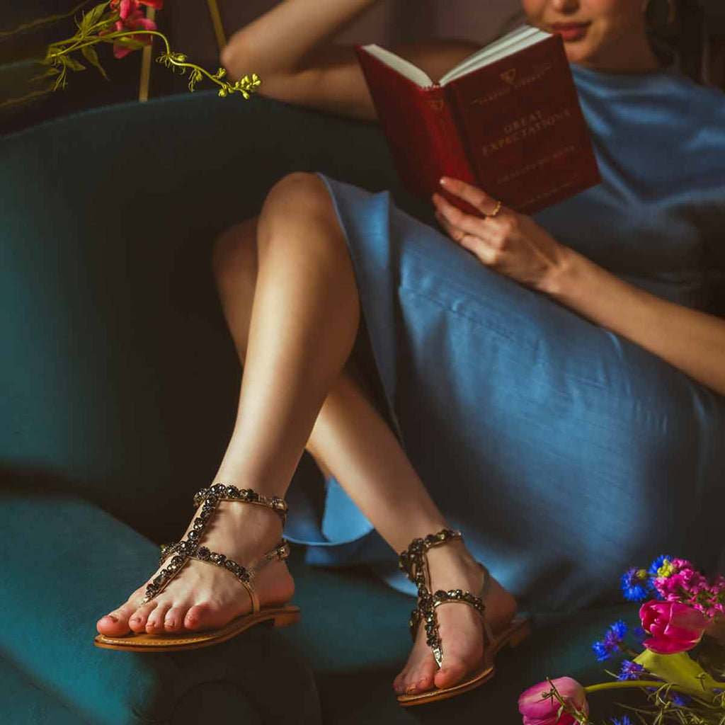 Introducing Saint Zuri's Black Stone Embellished Platin Leather Flat Sandals! Elevate any outfit with these stylish luxe flats, adorned with beautiful black stones. Perfect for any occasion, these sandals are a must-have addition to your shoe collection. Your feet will thank you!